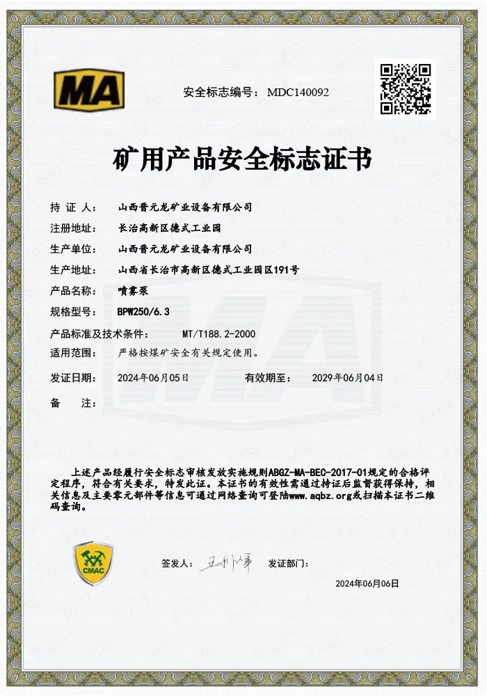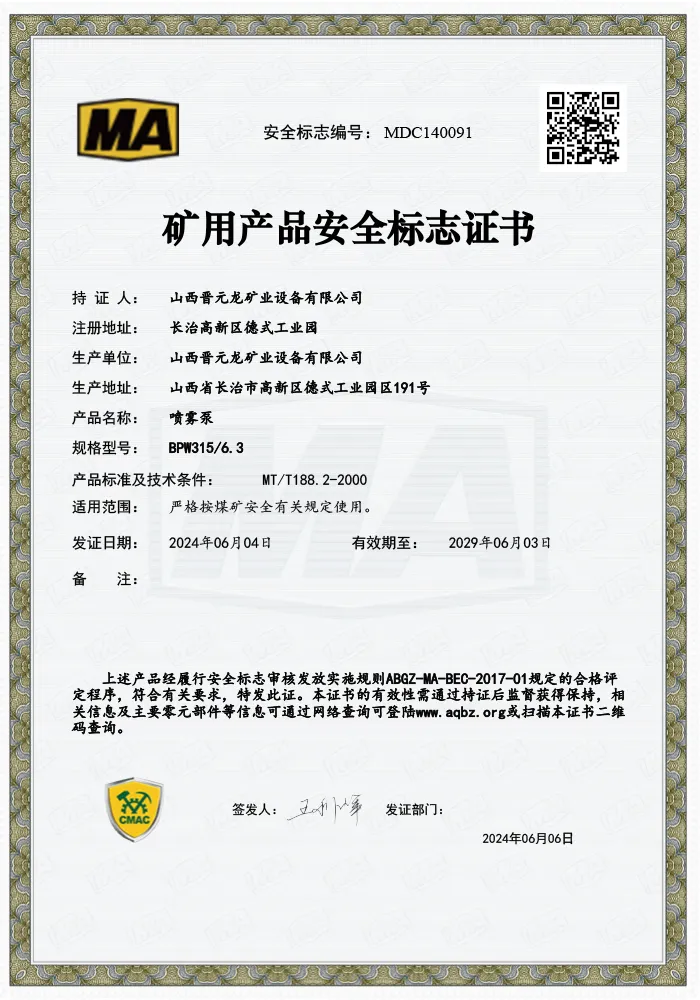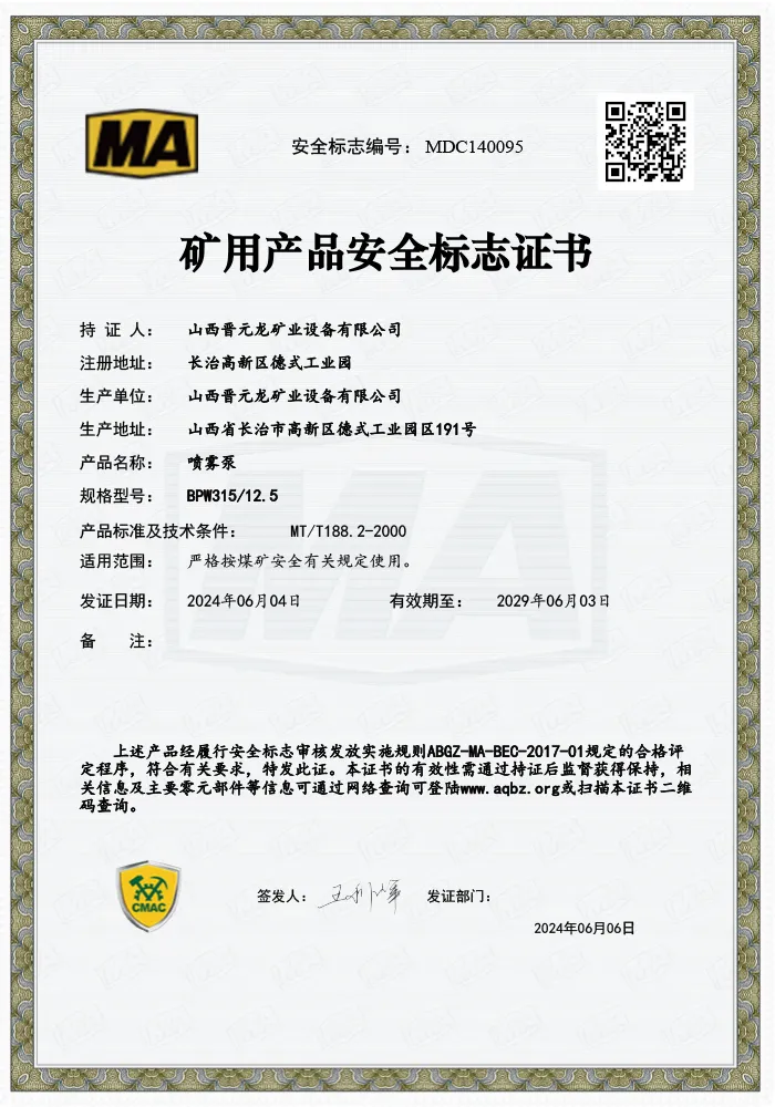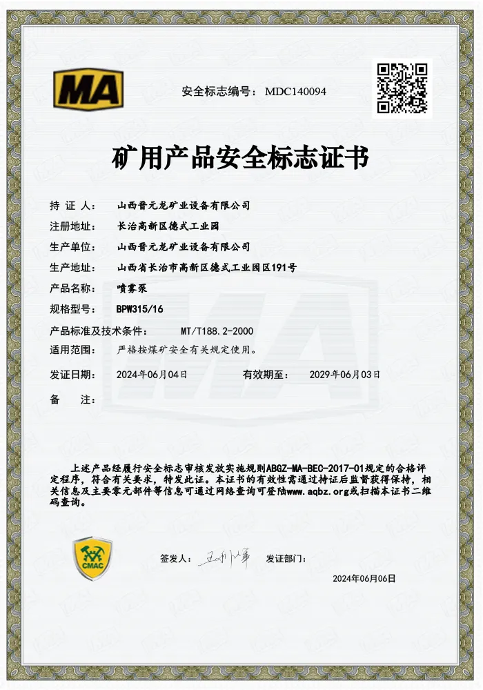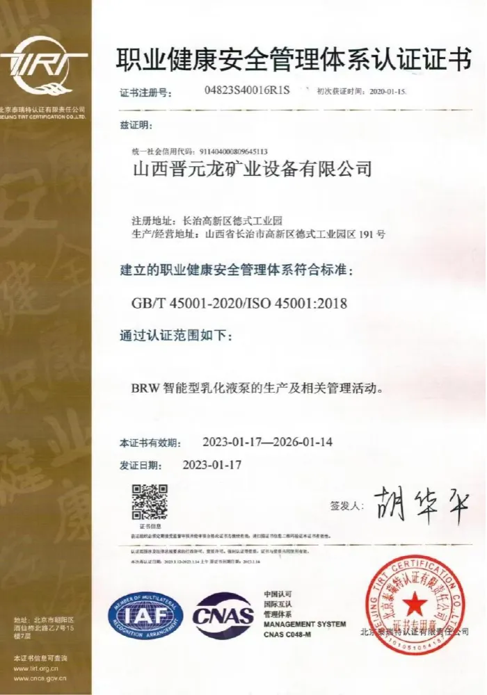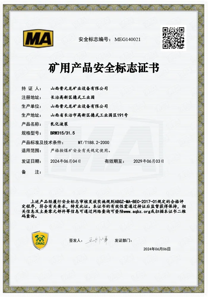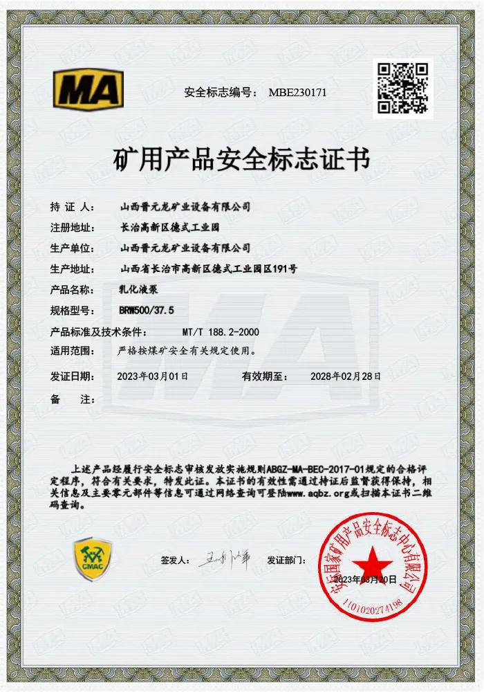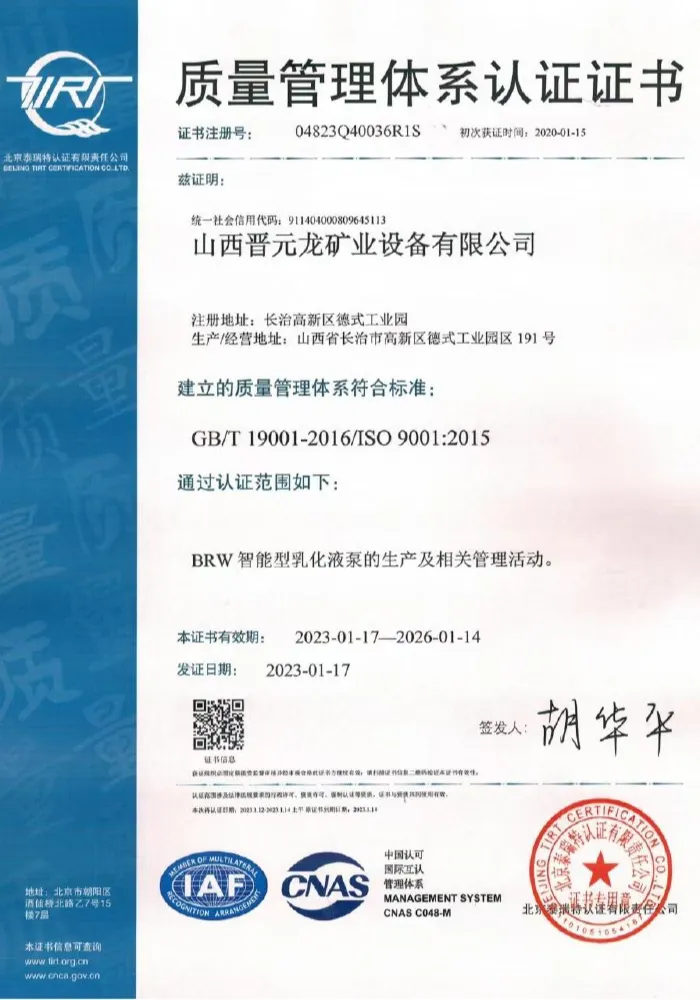 Компания придерживается управленческих инноваций и активно внедряет «Стратегию обеспечения качества», получив сертификаты безопасности угольной промышленности на более чем 30 типов эмульсионных и распылительных насосов, используемых в угольных шахтах. Мы внедрили комплексную систему контроля и управления качеством и получили сертификаты системы менеджмента качества ISO9001:2005 и системы менеджмента охраны труда и техники безопасности OHSAS14001:2007.